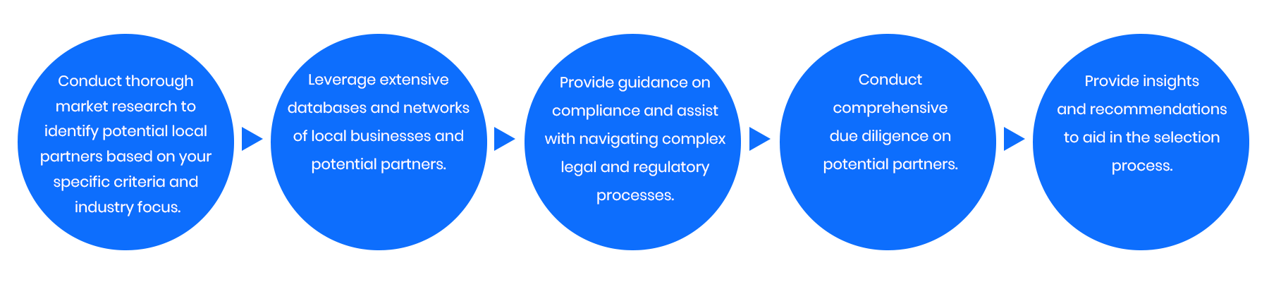 Many foreign companies resort to building partnerships with locals to expand their businesses or target a new customer base. Local partners provide valuable market insights of a specific demographic, have established networks for sales/distribution, have sound regulatory knowledge, and encompass resources required for operational support. HandsGrow Consulting specializes in market entry and provide valuable assistance to clients in identifying and filtering potential local partners by understanding their criteria for a local partner with thorough market research. We use industry reports, government databases, trade associations, online resources and directories to gather information and research & filter potential partners. We have established networks for assisting our clients in partner identification and due diligence for legal issues or creditworthiness. While shortlisting the potential partners, we consider factors such as financial stability, track record, and reputation.